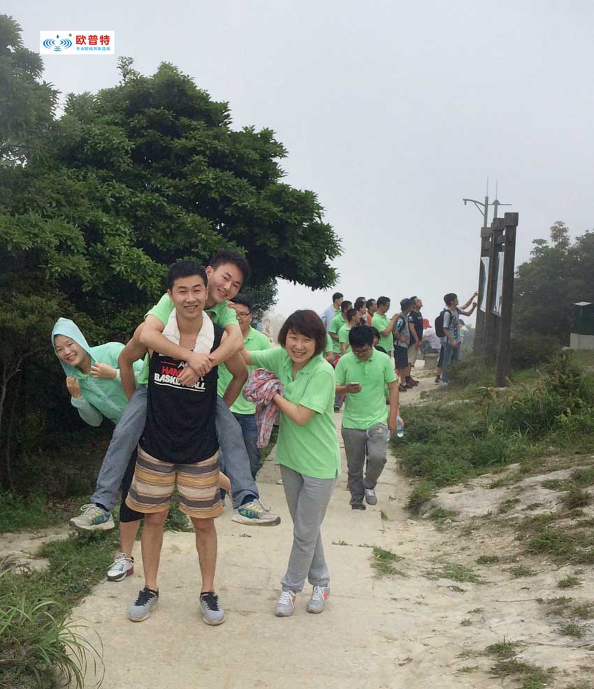 當然每位小伙伴們體質不一樣,有人一路狂奔,也有人慢慢落后,我們商務美女小希本來三分之一路程已然到達體能局限,準備放棄,此時我們老大蔣帥伸出了他有力的大手,并不斷的鼓勵,誘導小伙伴設立自己小目標,然后到達終點。這正是我們歐普特人不放棄,不拋棄每一位家人。使我印象最深刻的是:當最后一位小伙伴沖向山頂,一起和團隊擁抱匯合的時候,我們留下了激動喜悅淚水。人一定要有自己設定的目標,并把他一一分解成每一個小目標,逐一完成,建立自己的信心,直至完成終極目標!